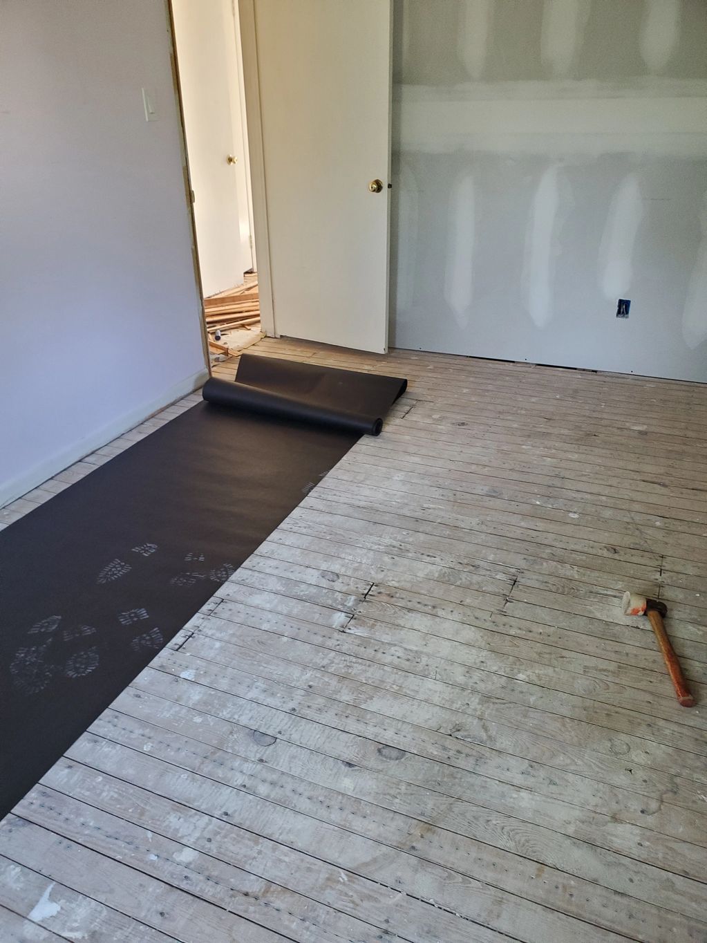 Water damaged wood flooring was removed down to the original wood slat subfloor.